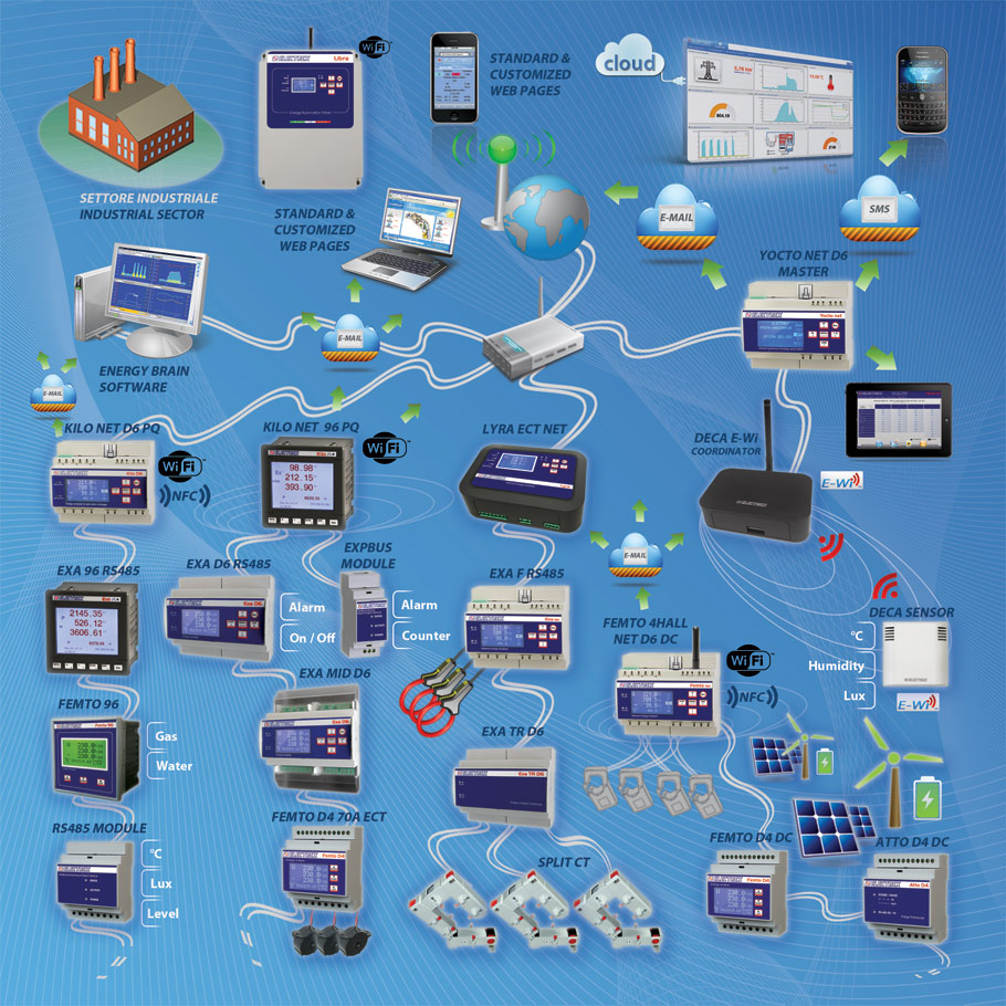 With a single system, you can keep track of all energy vectors (electricity, gas, water, etc.), of environmental parameters related to them (temperature, humidity, luminosity, CO2, etc.), of process parameters (compressed air , calories, level, status, etc.); measure the operating time of a load / appliance using a single reference clock; manage Energy Automation – Industry 4.0 processes (automate the management of ON/OFF switches, automatic adjustments, remote management, alarms and more) to achieve the main objective: to reduce energy costs and avoid outages.