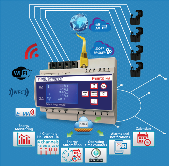 The Femto 4Hall D6 is an DC Energy Analyzer & Web Data Manager with an embedded web server and multiple communication ports (Ethernet, Wi-Fi, RS485, ExpBus, NFC).